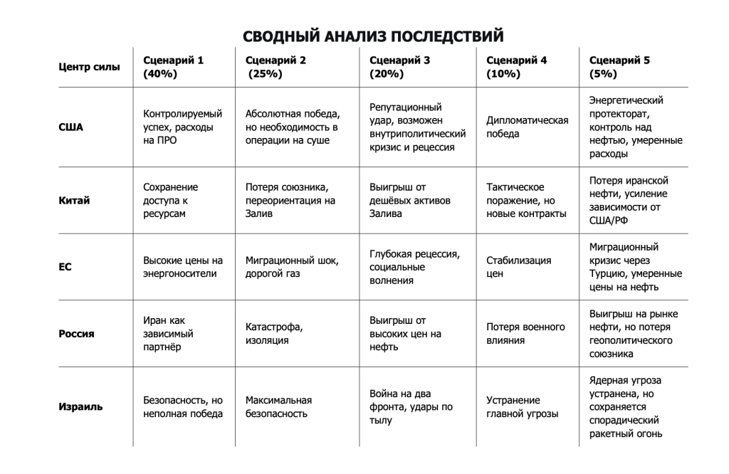Глобальный уровень: США и Израиль демонстрируют военное превосходство, но не достигают полной победы. Китай и Россия получают возможность дипломатического маневрирования, предлагая Ирану экономическую поддержку в обмен на сохранение зависимости. Формируется «серый» пояс нестабильности от Персидского залива до Восточного Средиземноморья.