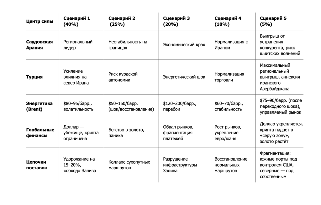 Наиболее вероятным исходом (40%) является «неполный разгром» — Иран сохраняется как государство, но теряет возможность проецировать силу и остаётся под жёсткими санкциями. Этот сценарий ведёт к затяжной напряжённости, умеренно высоким ценам на нефть и постепенной перестройке глобальных цепочек поставок в обход зоны риска.